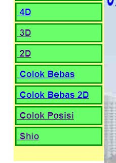 - 4D,Diskon 65 persen,kemenangan dikali 3000,tidak ditambah modal. - 3D,Diskon 59 persen,kemenangan dikali 400,tidak ditambah modal. - 2D,Diskon 29 persen,kemenangan dikali 70,tidak ditambah modal. - Colok Bebas,Diskon 6 persen,kemenangan dikali 1.5,ditambah modal. - Colok Bebas 2D,Diskon 10 persen,kena dua angka X 6,kena tiga angka X 10,kena empat angka X 16,ditambah modal. - Colok Posisi,Diskon 6 persen,kemenangan dikali 8,ditambah modal. - Shio,Diskon 2 persen,kemenangan dikali 9.5,ditambah modal. |